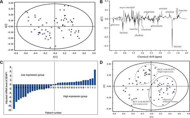 Figure 1: High SENP1 expression level is associated with enhanced glycolysis in ccRCC. (A) Metabolite profiles between ccRCC tumor tissues and adjacent normal tissues. PLS-DA scores plots based on 1H NMR spectra of extracts obtained from tumor tissues (□) and paired normal adjacent tissues (■) of 36 ccRCC patients. (B) Loading plot revealing the spectral regions responsible for the discrimination of the PLS-DA model shown in (A). (C) Relative mRNA expression levels of SENP1 in ccRCC. Expression levels of SENP1 in the 36 pairs of human ccRCC tumor tissues (T) and normal adjacent tissues (N) were tested using qRT-PCR. The ratio of T/N mRNA level for each pair was transformed with log base 2, which represent the relative mRNA expression level of SENP1. (D) Metabolic profile of ccRCC was associated with the expression level of SENP1. PLS-DA scores plots based on 1H NMR spectra of ccRCC tumor tissues with relative SENP1 high expression (□) and SENP1 low expression (O), and the matched adjacent tissues of ccRCC with SENP1 high expression (■) and low expression (●).