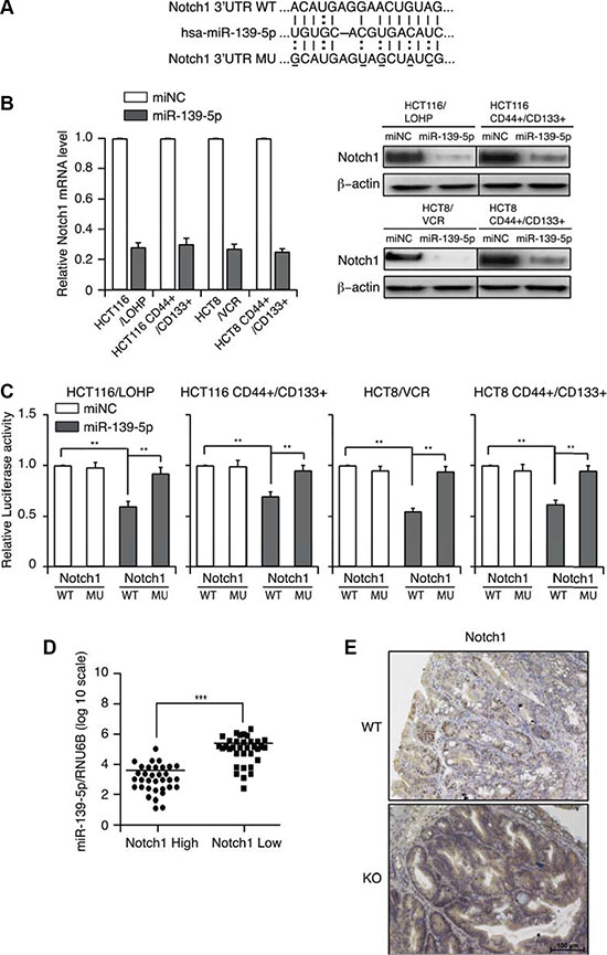 Figure 4: MiR-139-5p directly binds to NOTCH1 in colon cancer cells. (A) Schematic representation of putative miR-139-5p binding sites in the 3′-UTR of NOTCH1 mRNA, and the mutations introduced into the NOTCH1 3′-UTR regions. (B) NOTCH1 mRNA and protein expression were determined by qRT-PCR and Western blotting. (C) Wild-type (WT) or mutated (MUT) NOTCH1 reporter constructs were co-transfected with miR-139-5p into drug-resistant or CD44+/CD133+ cells. The relative luciferase activities were measured. (D) MiR-139-5p expression correlated inversely with NOTCH1 expression in CRC samples. (E) Representative images of the immunohistochemical examination of Notch1 in mouse tumors from miR-139-5p knockout and WT mice. Each figure is a representative of three independent experiments.