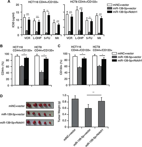 Figure 6: NOTCH1 restoration counteracts the inhibitory effects of miR-139-5p in CD44+/CD133+ cells. (A) NOTCH1 restoration significantly increased the IC50 values reduced by miR-139-5p. (B) The percentage of CD44+ cells reduced by miR-139-5p was partly reversed by NOTCH1 restoration. (C) The percentage of CD133+ cells reduced by miR-139-5p was partly reversed by NOTCH1 restoration. (D) Tumors derived from HCT116 CD44+/CD133+ cells transfected with the vector, miR-139-5p or miR-139-5p plus NOTCH1 were implanted subcutaneously. The weights of the harvested tumors were measured.