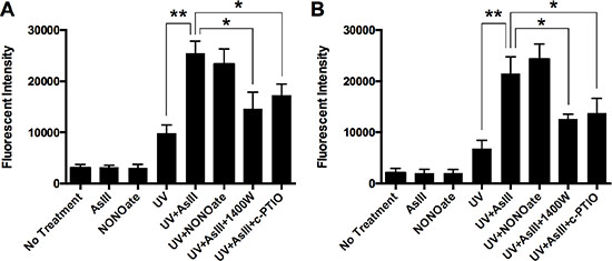 Figure 1: RNS contribute to AsIII enhanced UV-induced DNA double-strand break. (A) HEKn cells were treated by 10 μM NONOate, 1 μM sodium AsIII, 100 μM 1400W with 1 μM AsIII, or 100 μM carboxy-PTIO (c-PTIO) with 1 μM AsIII for 24 h. In some samples, cells were exposed to 2 kJ/m2 UV radiation at 4 hrs before collection. Phospho-H2AX level was then measured by flow cytometry, represented by Mean Channel Fluorescence (MCF). AsIII significantly increased UV-induced DNA double strand break, which could be reduced by iNOS inhibition (1400 W) or NO scavenging (c-PTIO) (B) HaCat cells were treated with the same conditions. Similar profiles of phospho-H2AX levels were observed. Barcharts show MCF ± SD; *p < 0.05, **p < 0.01 (student’s t-test); n = 3.