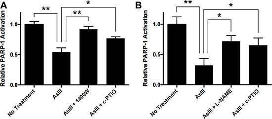 Figure 2: AsIII inhibited PARP-1 activity in an RNS-dependent manner. (A) In HEKn cells, iNOS induction and NO production contributes to PARP-1 activity inhibition by AsIII. HEKn cells were treated with 1 μM sodium AsIII, 100 μM 1400W with 1 μM AsIII, or 100 μM carboxy-PTIO (c-PTIO) with 1 μM AsIII for 24 h. Then PARP-1 activity was measured as described in the methods section. AsIII inhibited PARP-1 activity, but inhibition of iNOS (1400W) or scavenging of NO (c-PTIO) rescued AsIII-inhibited PARP-1 activity. (B) Similar results are shown for HaCat cells. HaCat cells were treated by 1 μM sodium AsIII, 100 μM L-NAME with 1 μM AsIII, or 100 μM carboxy-PTIO (c-PTIO) with 1 μM AsIII for 24 h. NOS inhibition by L-NAME and NO scavenging by c-PTIO rescued AsIII-inhibited PARP-1 activity. Barcharts show mean ± SD; *p < 0.05, **p < 0.01 (student’s t-test); n = 3.