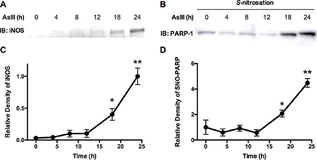 Figure 3: AsIII-induced S-nitrosation on PARP-1 protein correlates to iNOS expression in cells. (A) Immunoblotting analysis of iNOS expression time course. HEKn cells were treated with 1 μM AsIII. iNOS protein levels were then analyzed by immunoblotting at indicated time points. (B) PARP-1 S-nitrosation time course. HEKn cells were treated with 1 μM AsIII. At the indicated time points, cells were lysed and the modified biotin-switch method was applied to purify S-nitrosated proteins, from which S-nitrosated PARP-1 was then analyzed by immunoblotting. (C) and (D) are densitometric analyses of immunoblotting results (A) and (B), respectively, using β-actin and total PARP-1 protein as corresponding loading controls. iNOS was significantly induced starting from 18 hrs. At 24 h, iNOS protein level was about 30 times higher than 0 h. PARP-1 S-nitrosation also significantly increased, starting from 18 h of AsIII treatment. At 24 h, S-nitrosation of PARP-1 increased more than 4 fold compared to 0 h. Plots show mean ± SD; *p < 0.05, **p < 0.01 (student’s t-test vs. 0 h); n = 3.