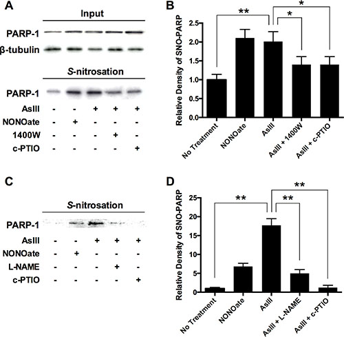 Figure 4: AsIII-induced PARP-1 S-nitrosation resulting from RNS induction. (A) AsIII-induced PARP-1 S-nitrosation in an iNOS- and NO-dependent manner. HEKn cells were treated with 10 μM NONOate (NO donor), 1 μM sodium AsIII, 100 μM 1400W (iNOS inhibitor) with 1 μM AsIII, or 100 μM carboxy-PTIO (c-PTIO, NO scavenger) with 1 μM AsIII for 24 h. The various treatments did not change PARP-1 protein level (top panels). PARP-1 S-nitrosation was analyzed by modified biotin-switch assay and immunoblotting. (B) Densitometric analysis of bottom panel (A). AsIII induced PARP-1 S-nitrosation, as did NONOate. Inhibiting iNOS or scavenging NO decreased AsIII-induced PARP-1 S-nitrosation. (C) Similar results are obtained in HaCat cells. AsIII-induced S-nitrosation on PARP-1 was significantly blocked by NOS inhibition (L-NAME) or NO scavenging (NONOate). (D) Densitometric analysis of bottom panel (C). Barcharts show mean ± SD; *p < 0.05, **p < 0.01 (student’s t-test); n = 3.