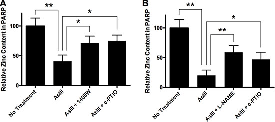 Figure 6: AsIII induces zinc loss from PARP-1 through RNS. (A) In HEKn cells, iNOS and NO contributed to AsIII-induced zinc loss from PARP-1. HEKn cells were treated with 1 μM sodium AsIII, 100 μM 1400W with 1 μM AsIII, or 100 μM carboxy-PTIO (c-PTIO) with 1 μM AsIII for 24 h. Zinc content in PARP-1 was then measured as described in the methods section. AsIII caused zinc loss from PARP-1. However, inhibition of iNOS (1400W) or scavenging of NO (c-PTIO) rescued zinc content in PARP-1. (B) Similar results were seen in HaCat cells. HaCat cells were treated with 1 μM sodium AsIII, 100 μM L-NAME with 1 μM AsIII, or 100 μM carboxy-PTIO (c-PTIO) with 1 μM AsIII for 24 h. NOS inhibition by L-NAME and NO scavenging by c-PTIO attenuated AsIII-caused zinc loss from PARP-1. Barcharts show mean ± SD; *p < 0.05, **p < 0.01 (student’s t-test); n = 3.