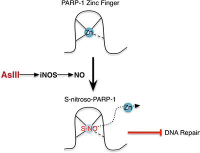 In summary, PARP-1 S-nitrosation by AsIII constitutes an important molecular mechanism by which AsIII inhibits PARP-1 through RNS. The findings may benefit not only our understanding of the mechanism of AsIII inhibition of DNA repair, but also future investigations into prevention of and intervention into AsIII co-carcinogenesis.