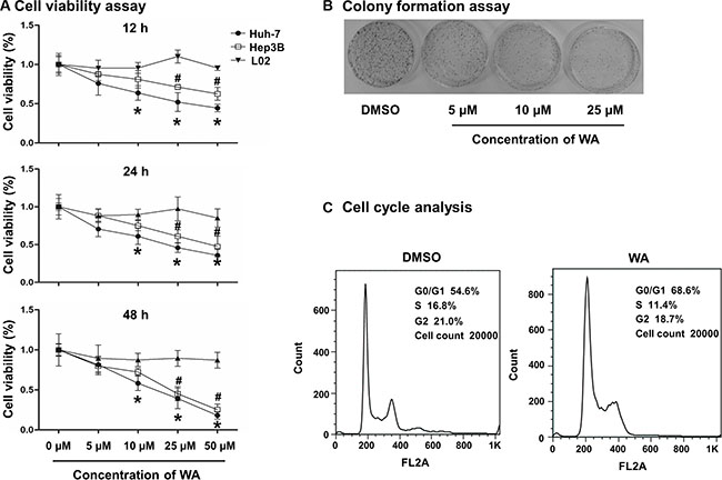 Figure 1: WA induced cell death and cell growth arrest. WA at doses of 5, 10, 25 and 50 μM were applied in Huh7, Hep3B and L02 cells for cell viability study (A). Different time points (12, 24 and 48 h) were studied after WA treatment (A). WA were treated to Huh7 cells for the colony assay study at concentrations of 5, 10 and 25 μM for 15 days prior to the clear observation of colonies (B). Cell cycle analysis was conducted in response to WA treatment at concentration of 25 μM by using flow cytometer (C). All data are expressed as mean ± S.D. *p < 0.05 Huh7 cell versus L02 cell; #p < 0.05 Hep3B versus L02 cell. *p < 0.05 DMSO versus WA;