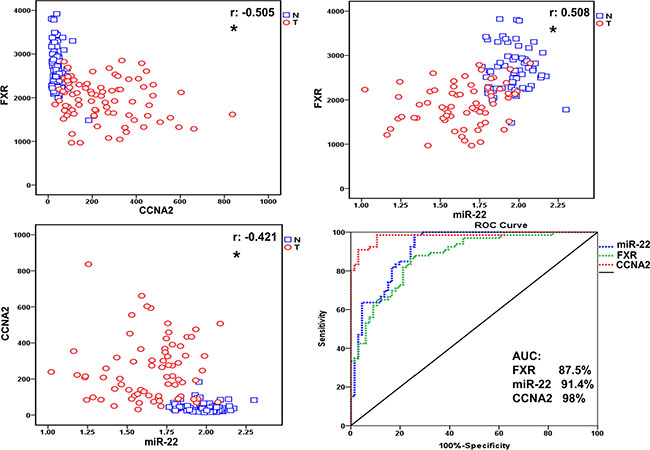 Figure 2: Repression of FXR and miR-22, along with upregulation of CCNA2, were observed in tumor tissues relative to adjacent normal ones in HCC patients. The correlation and relative expression were visualized in the plot. The blue open box represents normal tissues and red open circle represents the tumor ones. The correlation between FXR, miR22 and CCNA2 were valued by Pearson correlation coefficient (r, *p < 0.05.). The ROC curve is obtained by plotting sensitivity on the y-axis against specificity on the x-axis.