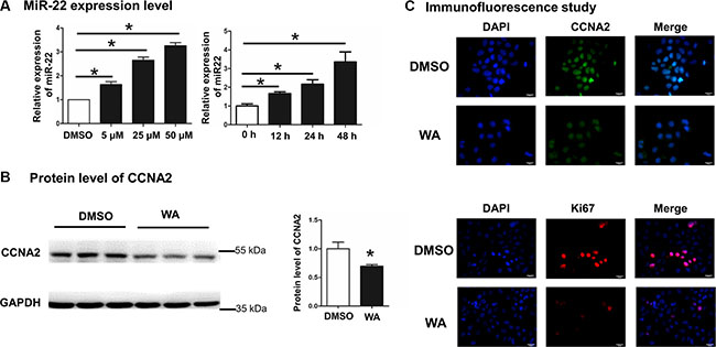 Figure 3: WA treatment induced miR-22 expression and repressed CCNA2 protein level. Dose-responsive and time-course experiments were conducted by WA treatment for 48 h and the expression level of miR-22 was analyzed by Real time-PCR (A). The protein level of CCNA2 was detected by western blot after WA treatment at dose of 25 μM for 48 h (B). Immunofluorescence study was performed by using anti-CCNA2 and anti-ki67 antibodies after WA treatment at dose of 25 μM for 48 h (C). Data are presented as mean ± SD. *p < 0.05.