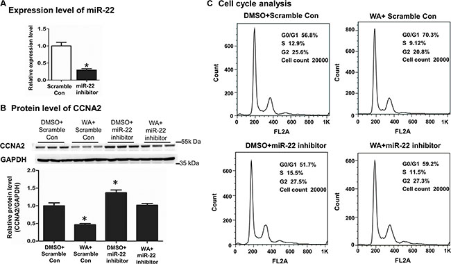 Figure 4: MiR22 silencing reversed the CCNA2 expression and the cell proliferation inhibition caused by WA treatment. Scramble control (50 nM) or miR-22 (50 nM) inhibitor were transfected into Huh7 cells. Forty-eight hours later, the expression of miR-22 were analyzed by Real time-PCR (A). After transfection with miR-22 inhibitor or scramble control for 6 h, WA (25 μM) or DMSO were treated for 48 h. Protein level of CCNA2 was measured by western blot (B) and cell cycle analysis was conducted by using flow cytometer (C). Data are presented as mean ± SD. *p < 0.05, versus DMSO+Scramble Con.