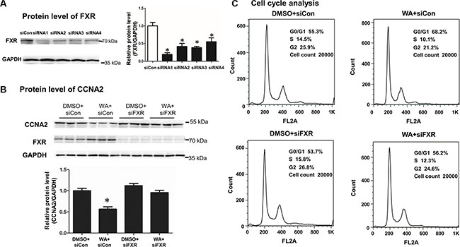 Figure 5: FXR silencing abolished the CCNA2 expression and the cell proliferation inhibition caused by WA treatment. The inhibitory efficacy of FXR was analyzed by western blot within different siFXRs (100 nM) (A). After transfection with siFXR or negative control for 6 h, WA (25 μM) or DMSO were treated for 48 h. Protein level of CCNA2 was measured by western blot (B) and cell cycle analysis was conducted by using flow cytometer (C). Data are presented as mean ± SD. *p < 0.05, versus DMSO+siCon.
