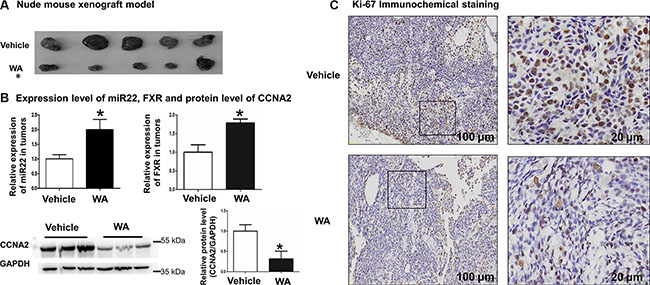 Figure 6: WA inhibited tumor masses in vivo in a subcutaneous xenograft mouse model of HCC. WA treatment significantly reduced the size of tumors (A). MiR22 and FXR expression level along with CCNA protein level were detected in tumors of WA-treated or untreated mice (B). Immunohistochemical staining was conducted by using anti-ki67 antibody in tumors of WA-treated or untreated mice (C). Data are presented as mean ± SD. *p < 0.05.