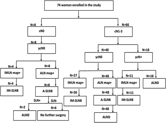 In the study, 74 female patients who had histologically proven clinical stage T1-T4, N0-N3, M0 primary invasive breast cancer treated at our breast cancer center between January 2012 and October 2015 were enrolled. Full course of NAC with anthracycline- and taxane-based regimens were performed before surgery. HER-2 positive were identified in 27 patients, and six of them received anti-HER-2 targeted therapy (trastuzumab) before surgery. Patients with inflammatory breast cancer and with a history of prior ipsilateral axillary surgery or radiotherapy, prior ASLNB, or excisional lymph node biopsy for pathology confirmation of axillary pathological status were excluded. The study was approved by the Shandong Cancer Hospital Affiliated to Shandong University Ethics Committee (No. SDTHEC20130324), informed consent was obtained from the patients and all procedures were in accordance with the ethical standards of the responsible institutional committee on human experimentation and with the Helsinki Declaration.