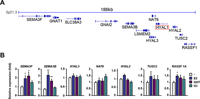 Figure 2: Regulation of the 3p21.3 locus by estrogen and antiestrogens. A. Representation of the genes contained in the 3p21.3 locus using IGV. B. qPCR analysis of genes located in the vicinity of HYAL1 in the 3p21.3 locus. MCF-7 cells were treated with 10nM E2, 100nM OHT, or 100nM ICI 182,780 for 16h and results were normalized to RPLP0 expression and expressed as fold response compared to vehicle-treated cells set at 1.0. *, P < 0.05; **, P < 0.005.