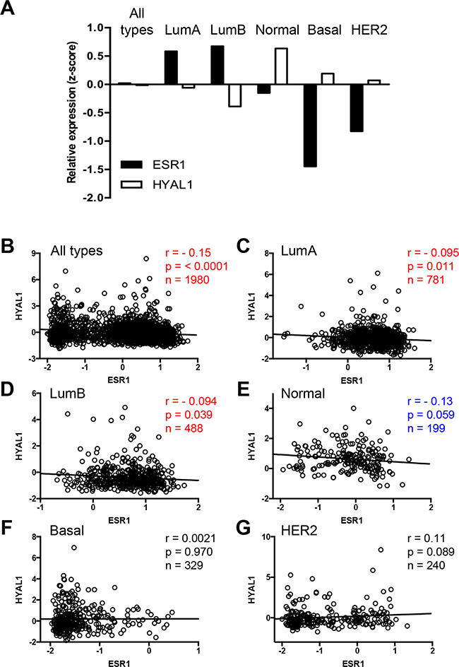 Inverse correlation of HYAL1 and ESR1 in breast cancer clinical samples