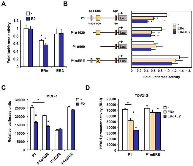 Figure 7: Regulation of the proximal promoter activity of HYAL1 by ERα. A. 293 cells were transfected with ERα or ERβ in the presence of a luciferase reporter construct containing the proximal P1 promoter of HYAL1. Cells were then treated or not with 10nM estradiol (E2) for 16h. Luciferase values were normalized to β-galactosidase activity and expressed as relative fold response compared to vehicle-treated mock transfected cells set at 1.0. B. Truncated regions of the HYAL1 proximal P1 promoter were analyzed for estrogen responsiveness in luciferase reporter assays as in (A) in response to ERα expression. The ERE-900 was also mutated (mERE) in the context of the P1 fragment. Cells were treated or not with 10nM estradiol (E2) for 16h. Luciferase values were normalized to β-galactosidase activity and expressed as relative fold response compared to vehicle-treated controls set at 1.0. C. HYAL1 wild-type, truncated, or mutated P1 promoter activity was determined in MCF-7 cells treated with 10nM E2 or vehicle for 16h. Cells were analyzed for luciferase activity as in (A). D. Same as in (C) except that ovarian cancer TOV21G cells were used. *, P < 0.05.