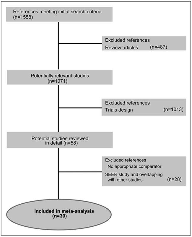 The PRISMA chart related to RCTs selection and search strategy is described in Figure 1. In the considered time-frame (2004-2015), 1558 studies were identified as full papers or meeting abstracts, while 1500 studies were initially excluded because reviews and/or for trial design. Thus, we examined in detail the remaining 58 trials. Among them, 28 trials were excluded because selection criteria were not met [30]. 30 trials for a total of 10530 patients were selected and included in the final analysis [5, 6, 10, 31-57].