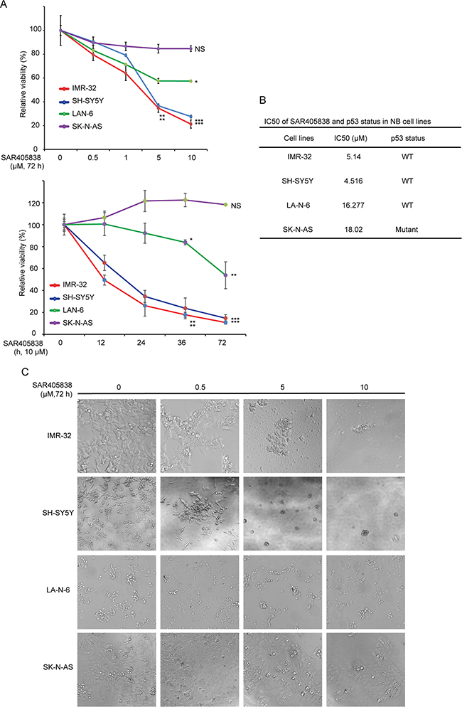 Figure 1: SAR405838 shows cytotoxic effects on p53 wild-type NB cell lines. A. Four NB cell lines were treated with increasing concentrations of SAR405838 for 72 hours or increasing treatment hours at 10 μM. Cell viability was assessed by CCK-8 assay. Data is represented as % vehicle ± S.D. with P < 0.05 (*), P < 0.01 (**), or P < 0.001 (***) (Student’s t-test, two-tailed) as indicated. B. The IC50 values of SAR405838 in each cell line listed were calculated in Prism 5 and based on the data collected in the cell viability assay. p53 status in NB cell lines was also shown. C. Morphological changes of the four different NB cell lines treated with increasing concentrations of SAR405838 for 72 hours were shown.