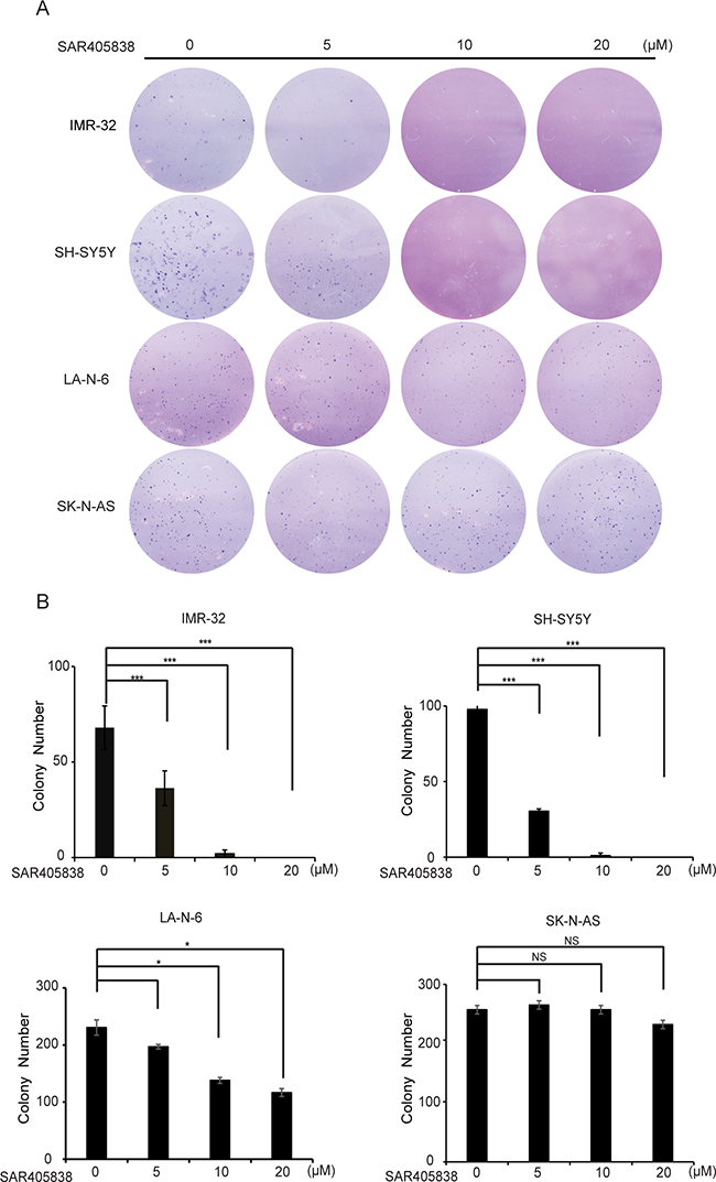 The soft agar assay for detecting colony formation abilities was performed as previously described [20]. Namely, a 5% (w/v) base agar layer was made by adding agar (214220, Difco Laboratories, Detroit, MI, USA) into distilled water and then autoclaving the mixture for 50 min before cooling in a 56 °C water bath. This solution was then mixed with RPMI and 10% FBS to a final concentration of 0.5%. To make the bottom agar layer, 2 mL of the 0.5% agar/RPMI solution were added to each well and cooled until semi-solid. The top agar layer was made of 1.5 ml 0.3% agar, and each NB cell line was counted and added to the mixture at 1 × 104 cells/well along with the indicated concentrations of SAR405838. Cells were grown at 37 °C for 2 to 3 weeks, and subsequently stained with 500 μL of 5 mg/mL Thiazolyl Blue Tetrazolium Bromide (MTT, M5655, Sigma). Images were captured by the microscope, and colonies were counted after 4 hours. Each assay was performed in triplicate.