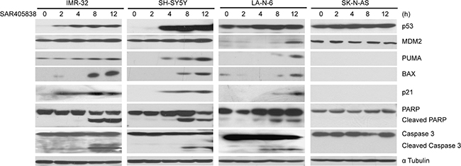 Figure 3: SAR405838 activates p53 downstream signaling pathway, and induces apoptosis in p53 WT NB cells. IMR-32, SH-SY5Y and SK-N-AS cells treated with 20 μM of SAR405838 and LA-N-6 cells with 50 μM of SAR405838 for various time points (0-12 hours), were lysed and subjected to SDS-PAGE followed by immunoblotting with the antibodies indicated. The anti-α Tubulin antibodies were used as a loading control for whole cell extracts.
