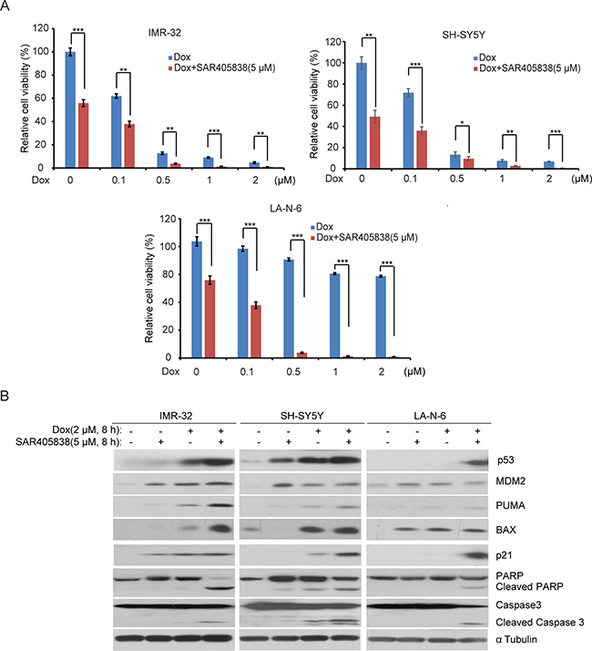 Figure 4: SAR405838 enhances the cytotoxic effect of Doxorubicin on NB cell lines. A. IMR-32, SH-SY5Y, and LA-N-6 cells were seeded in 96-well plates and incubated with the indicated concentrations of Dox plus DMSO or 5 μM of SAR405838 for 24 hours. Cell viability was then measured by CCK-8 assay. B. IMR-32, SH-SY5Y, and LA-N-6 cells were treated with either Dox (2 μM) alone, SAR405838 (5 μM) alone, or a combination of both for 8 hours. Then cells were lysed and subjected to SDS-PAGE followed by immunoblotting with the antibodies indicated. The α Tubulin antibodies were used as a loading control for whole cell extracts.