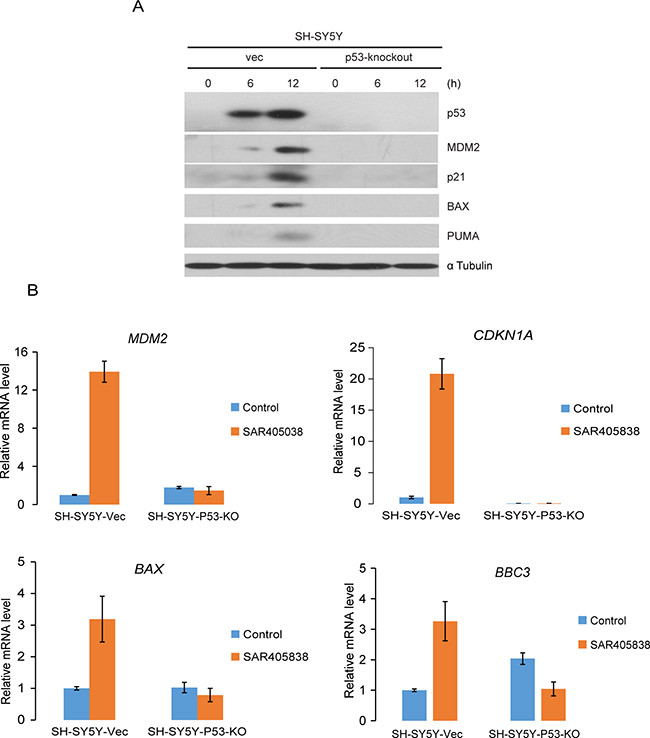 Figure 6: Intact p53-MDM2 axis is required for the effect of SAR405838 on NB cells. A. SH-SY5Y-vector and SH-SY5Y-p53-knockout cells were treated with10 μM SAR405838 for 0, 6, 12 hours, respectively. The cells were then lysed and subjected to SDS-PAGE, followed by immunoblotting with immunoblotting with the antibodies indicated. The α-Tubulin antibodies were used as a loading control for whole cell extracts. B. SH-SY5Y-vector and SH-SY5Y-p53-knockout cells were treated with 10 μM SAR405838 for 0 or 12 hours, respectively and collected for total RNA extraction. The relative RNA level for each gene indicated was measured by RT-PCR analysis.