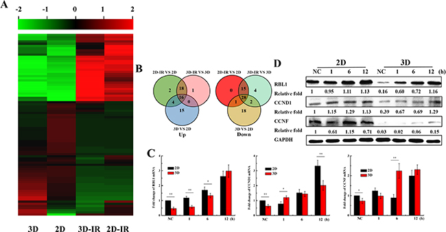 Figure 3: Expression of cell cycle regulation genes in irradiated 2D and 3D A549 cells. A. Microarray analysis of 84 cell cycle regulation genes expression profile in 2D and 3D A549 cells 12h after irradiation with 4Gy X-rays. B. Venn diagrams of different expression of 84 cell cycle genes. C. Relative expression levels of RBL1, CCND1 and CCNF were measured by qRT-PCR at the indicated time points after 4 Gy X-rays in 2D and 3D A549 cells. GAPDH were used as internal control. D. The expressions of RBL1, CCND1 and CCNF at the indicated time points after 4 Gy X-rays in 2D and 3D A549 cells by western blot assay. Each data point represents the mean of three separate experiments. Bars are the standard errors. Significance was determined by Student’s t-test. *, P < 0.05; **, P < 0.01.