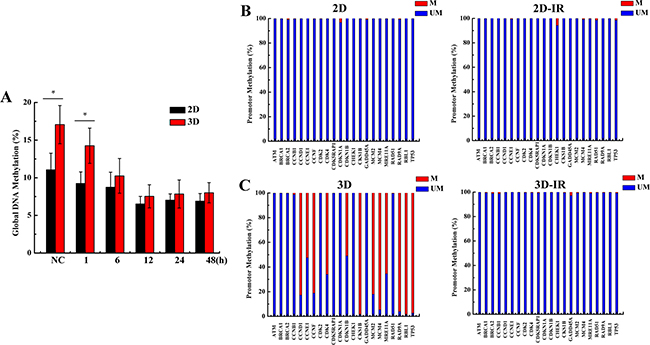 Figure 4: Methylation of genome and cell cycle regulation genes promotor status in irradiated 2D and 3D A549 cells. A. Global DNA methylation status at the indicated 12h time points after 4 Gy X-rays irradiation in 2D and 3D cells. B&C. Methylation PCR array of 22 cell cycle genes promotor at 12 h after irradiation with 4 Gy X-rays in 2D and 3D cells. Each data point represents the mean of three separate experiments. Bars are the standard errors. Significance was determined by Student’s t-test. *, P < 0.05; **, P < 0.01.