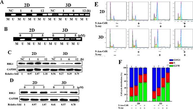 Figure 5: Methylation status of RBL1 promotor after X-rays or 5-Aza-CdR treatment and RBL1 expression in 3D A549 cells. A. The changes of promoter methylation status of RBL1 at indicated time points measured by MSP in 4 Gy X-ray irradiated 2D and 3D cells. B. The changes of promoter methylation status of RBL1 measured by MSP in 5-Aza-CdR treated 2D and 3D cells. C. The expression of RBL1 in 2D and 3D cells at indicated time points after irradiation with 4 Gy X-rays by Western blot assay. D. The expression of RBL1 in 5-Aza-CdR treated 2D and 3D A549 cells by Western blot assay. E&F. Cell cycle distribution of 2D and 3D cells after 4 Gy X-ray irradiation combined with 2 μM 5-Aza-CdR treatment. Each data point represents the mean of three separate experiments. Bars are the standard errors. Significance was determined by Student’s t-test. *, P < 0.05; **, P < 0.01.