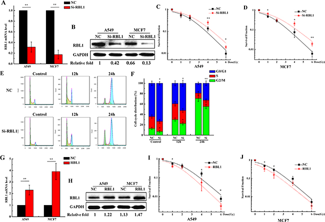 Figure 6: Knockdown of RBL1 enhances the radioresistance of 2D cultured A549 and MCF7 cells and decreases the G2/M arrest induced by X-ray. A. Relative expression levels of RBL1 mRNA were measured by qRT-PCR after transfected with RBL1-siRNA or negative control (NC) in 2D A549 and MCF7 cells. GAPDH were used as internal control. B. Western blot assay of RBL1 protein level after being transfected with RBL1-siRNA or NC into 2D A549 and MCF7 cells. C&D. Survival fractions of 2D A549 and MCF7 cells transfected with RBL1-siRNA or NC, was measured by colony formation assay after exposed to 0, 1, 2, 4 and 6 Gy X-rays. E&F. Cell cycle distribution of 2D A549 cells transfected with RBL1-siRNA or NC and then exposed 4 Gy X-rays. G. Relative expression levels of RBL1 mRNA were measured by qRT-PCR after being transfected with RBL1 overexpression vector or negative vector (NC) in 2D A549 and MCF7 cells. H. Western blot assay of RBL1 protein level after being transfected with RBL1 overexpression vector or NC into 2D A549 and MCF7 cells. I&J. Survival fractions of 2D A549 and MCF7 cells transfected with RBL1 overexpression vector or NC were measured by colony formation assay after exposed to 0, 1, 2, 4 and 6 Gy X-rays. Each data point represents the mean of three separate experiments. Bars are the standard errors. Significance was determined by Student’s t-test. *, P < 0.05; **, P < 0.01.