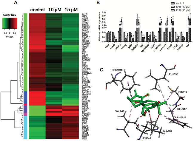 Figure 2: EriB exerted anti-angiogenic effect via the modulations of angiogenic genes expression and interaction with the ATP-binding sites of VEGFR-2. A. Heat map of 72 angiogenic genes (Supporting Information Table S1) expressions in zebrafish embryos after treatment with control or EriB (10 and 15 μM) for 72 h determined by transcriptome analysis (p < 0.05). The up-regulated mRNA expression in treated group with respect to control was represented by red colour and down-regulated mRNA expression was presented as green colour. The scale of color intensity was positively correlated to the fold change. B. Real-time PCR validation of selected gene expressions (Fold change >2). The specific genes name: anxa6, annexin A6; cdkn1a, cyclin-dependent kinase inhibitor 1A; Cebpg, CCAAT/enhancer binding protein (C/EBP), gamma; gdf5, growth differentiation factor 5; igfbp6b, insulin-like growth factor binding protein 6b; kdr, kinase insert domain receptor; lgals3bpb, galactoside-binding, soluble, 3 binding protein b; loxl1, lysyl oxidase-like 1; pcdh10a, protocadherin 10a; serpinf1, serpin peptidase inhibitor, clade F (alpha-2 antiplasmin, pigment epithelium derived factor), member 1; sesn2, sestrin 2; sfrp2, secreted frizzled-related protein 2; spon2b, extracellular matrix protein; txn, thioredoxin. C. The interactions of EriB to the amino acid residues in the ATP-binding site of VEGFR-2. EriB could stably bind to the ATP-binding pocket near the hinge region, with the interaction with residues Cys 919, Phe 1045, Val 848, Glu 917, Phe 918, Leu 1035, Leu 840.