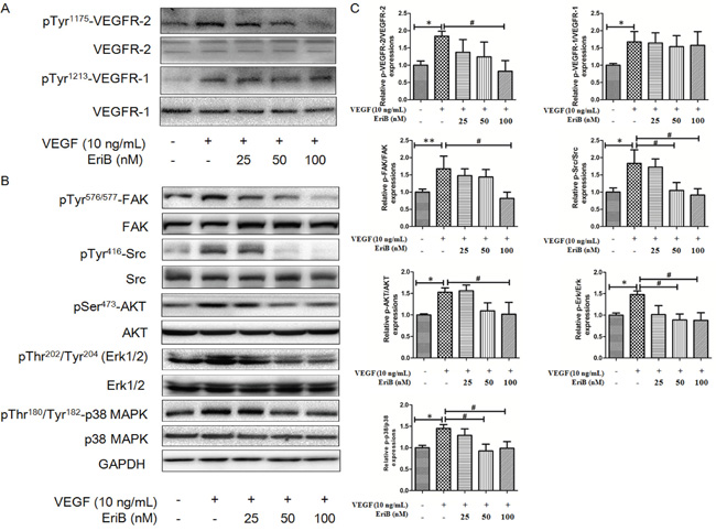 Figure 5: EriB inhibited the activation of VEGFR-2 induced by VEGF and suppressed VEGFR-2-mediated downstream signaling pathway. A. HUVECs were pretreated with various concentrations (25, 50 and 100 nM) of EriB for 24 h before exposure to VEGF (10 ng/mL) for 30 min. Then the cells were harvested and western blotting was performed to detect pTyr1175-VEGFR-2 pTyr1213-VEGFR-1 and total VEGFR-2, VEGFR-1 expressions. B. HUVECs were pretreated for 24 h with various concentrations (25, 50 and 100 nM) of EriB before exposure to VEGF (10 ng/mL) for 120 min. Then whole cell extracts were extracted for western blotting analysis to detect modulation of VEGFR-2-mediated signaling pathway. C. The histograms showed quantified results of protein levels, which were adjusted with corresponding GAPDH protein level. Each value was expressed as fold of control mean + S.D. (n=3). * p < 0.05, ** p < 0.01 compared with control, # p < 0.05 compared with VEGF group (one-way ANOVA).