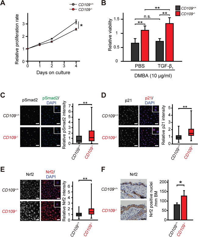 Figure 2: Cellular characteristics of primary mouse keratinocytes. A. CD109+/+ and CD109−/− keratinocyte proliferation rates, measured by WST-1 assay (n = 6 per group). B. Viability of CD109+/+ and CD109−/− keratinocytes in the presence of DMBA (10 μg/ml), measured by WST-1 assay (n = 3 per group). Cells were pretreated with PBS only (control) or TGF-β1 (10 ng/ml) for 24 h before incubation with DMBA. C-E. Fluorescence immunostaining for pSmad2 (C), p21 (D), and Nrf2 (E) in CD109+/+ and CD109−/− keratinocytes (n = 90 per group). Insets show higher magnification of positive cells. Scale bars, 50 μm. Right graphs, quantification of immunofluorescence intensity. F. Immunohistochemical staining for Nrf2 in the skin of 6-week-old CD109+/+ and CD109−/− mice (left panels). The number of Nrf2-positive cells in epidermis was counted per mm of basement membrane (BM) (right graph; n = 4 per group). DMBA, 7, 12-dimethylbenz (α) anthracene; *P < 0.05; **P < 0.01.