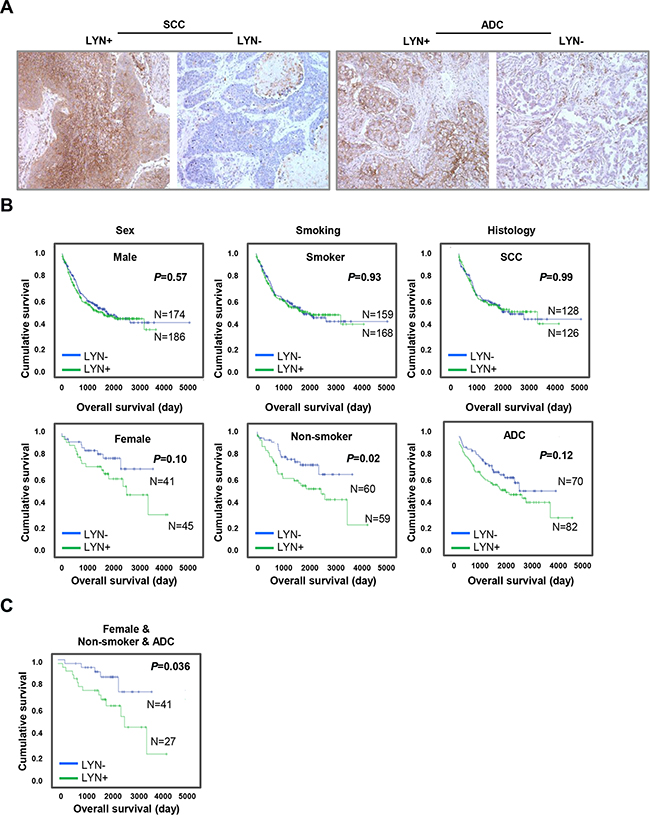 LYN expression is associated with poor survival in the lung ADC subgroup
