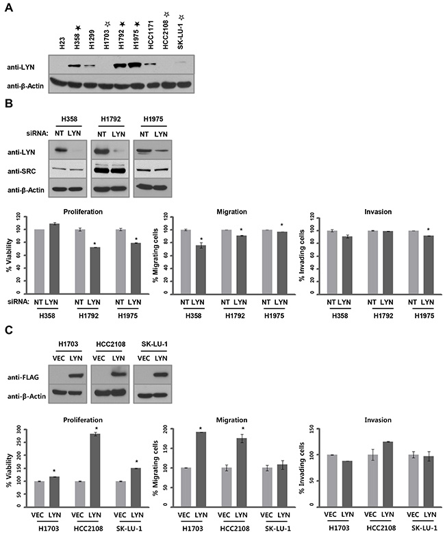 Because LYN expression is associated with clinical outcomes in lung adenocarcinoma, and in patients with ADC in general, we examined the functions of LYN in ADC cell lines. We first compared LYN protein levels in ADC cell lines using western blots. Five of nine ADC cell lines had high LYN levels (Figure 2A), which was consistent with our results in the TMA specimens (Supplementary Table S1, 82 of 151 ADC cases, 54.3%). We next examined whether LYN regulates the growth of ADC cells. ADC cell lines expressing high levels of LYN (H358, H1792, and H1975; filled asterisk) were treated with LYN siRNA (or control non-targeting siRNA), and LYN depletion was confirmed using western blots. LYN knockdown reduced cell proliferation (H1792 and H1975; P < 0.05), migration (H358, H1792, and H1975; P < 0.05), and invasion (H1975; P < 0.05) (Figure 2B, Supplementary Figure S2 and Supplementary Table S5). In complementary experiments, ADC cell lines expressing low or undetectable levels of LYN (H1703, HCC2108, and SK-LU-1; empty asterisk) were transfected with LYN expression vectors (or empty vector control), and LYN overexpression was confirmed using western blots. LYN overexpression enhanced cell proliferation (H1703, HCC2108, and SK-LU-1; P < 0.05) and cell migration (H1703 and HCC2108; P < 0.05), but not invasion (Figure 2C). These results indicate that LYN contributes to tumorigenic phenotypes in lung ADC cells.