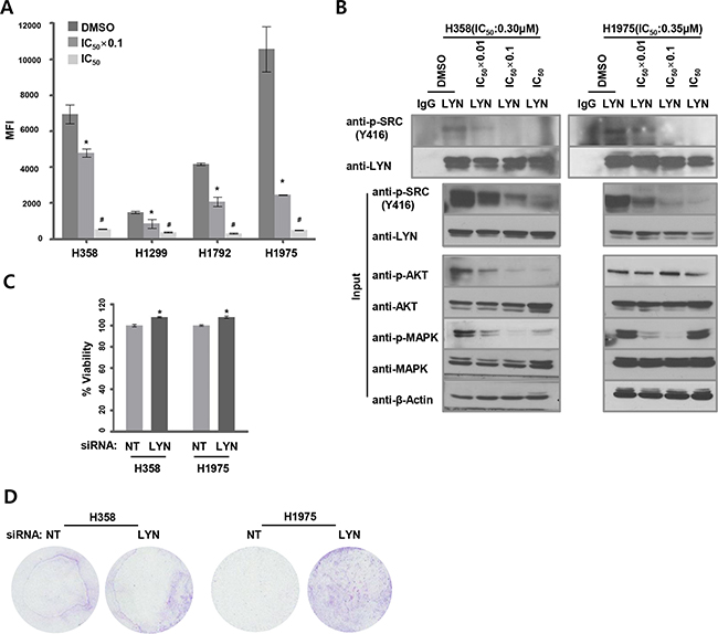 Figure 3: Dasatinib suppresses LYN activity. A. LYN tyrosine (Y396) phosphorylation levels were quantified using ELISA in dasatinib-treated ADC cells. Cells were treated with dasatinib at 2 different concentrations (DMSO as a control, IC50 x 0.1, and IC50). Median fluorescence intensity (MFI) values indicate levels of active pY396-LYN (n = 3; *, P < 0.05 vs. DMSO; #, P < 0.05 vs. IC50 x 0.1). B. Activated pY396-LYN levels were also measured by immunoprecipitating lysates from H358 and H1975 cells with an LYN antibody and immunoblotting with a cross-reactive pY416-SRC antibody. Cells were treated with dasatinib at 3 concentrations, and activated AKT and MAPK levels were determined using western blots. C. Cells were treated with dasatinib (DMSO as a control, IC50 × 0.1) 24 hrs after siRNA-mediated LYN knockdown. The effect of LYN knockdown on cell proliferation was analyzed using the WST-1 assay (n = 3; bars, SE; *, P < 0.05; Student’s t-test). D. Cells were treated with dasatinib (DMSO as a control, IC50) after LYN knockdown. The effect of LYN depletion on cell migration was determined using a transwell assay.