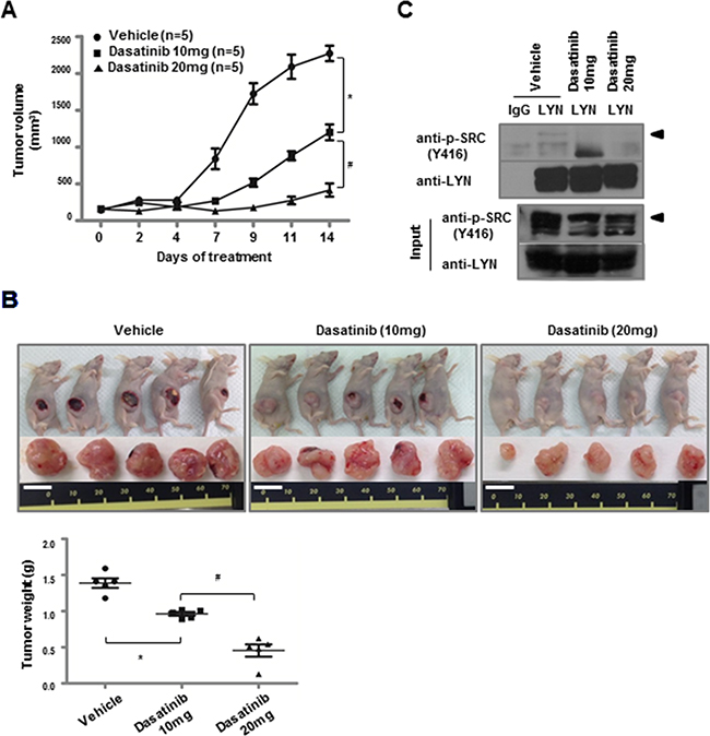 Figure 4: Dasatinib inhibits the growth of LYN-positive lung ADC xenografts. A. H1975 cells were injected subcutaneously into nude mice. Dasatinib treatment began when the average tumor size reached ~100 mm3. Dasatinib was intraperitoneally injected for 2 weeks at either 10 mg·kg-1·day-1 or 20 mg·kg-1·day-1 (*, P < 0.05 vs. vehicle; #, P < 0.05 vs. dasatinib [10 mg]). B. H1975 xenografts from (A) were resected, and tumor weights were measured at the time of tumor harvest (bars, mean and SD; *, P < 0.05 vs. vehicle; #, P < 0.05 vs. dasatinib [10 mg]; white bar = 1 cm). C. Immunoprecipitation was performed with an LYN antibody on lysates from H1975 xenograft tumors, followed by immunoblotting with a cross-reactive pY416-Src antibody (◀).
