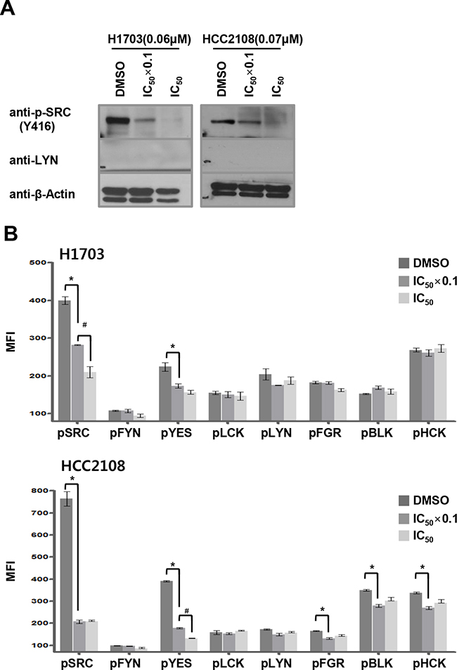 Figure 5: Dasatinib targets SRC and YES in LYN-negative lung ADC cells. A. Cells were treated with dasatinib at 2 different concentrations (DMSO as control, IC50 x 0.1, and IC50), and pSFK levels were assessed by immunoblot using a cross-reactive pY416-SRC antibody. B. SFK tyrosine phosphorylation levels were quantified using ELISA in dasatinib-treated ADC cells. Cells were treated with dasatinib at 2 different concentrations (DMSO as control, and IC50 x 0.1, and IC50). The MFI values indicate phospho-Tyr SFK levels (n = 3; bars, SE; *, P < 0.05 vs. DMSO; #, P < 0.05 vs. IC50 × 0.1).