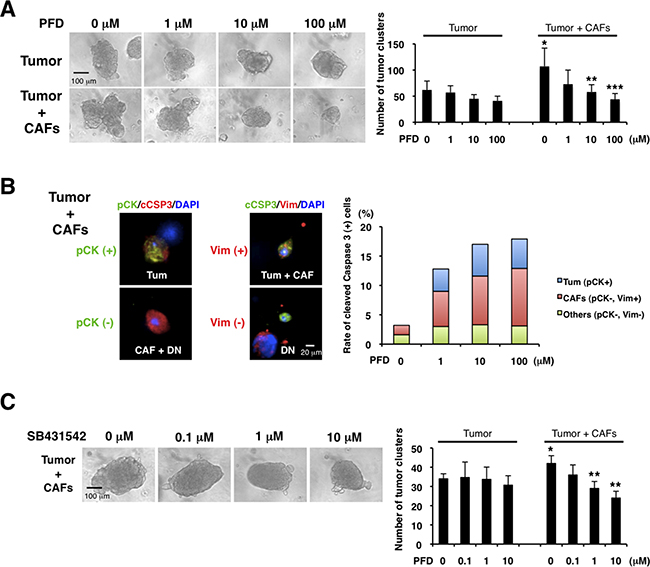 Figure 4: Pirfenidone inhibits TNBC growth induced by CAFs. We cultured CAFs derived from TNBC xenograft tumors (HCI-001), and 3D co-culture assayed the CAFs and aggregated 4T1 cells (tumor cluster) in Matrigel. A. We examined the effects of PFD (triplicate). CAFs increased the tumor cluster size and PFD inhibited the size increased by CAFs (left panel). Also, CAFs increased the number of tumor clusters and PFD decreased the tumor cluster number increased by CAFs (right panel). *p<0.05 compared to tumor (0 μM). **p<0.05 or ***p<0.02 compared to 0 μM (Tumor + CAFs). B. We conducted immunofluorescence of the 3D Matrigel cultures by using anti-pan-cytokeratin (pCK, green, left panel), anti-vimentin (Vim, red, middle panel) and cleaved caspase-3 (cCSP3, red, left and green, middle panels, respectively) antibodies. DAPI (blue) stained nuclei. 4T1 tumor cells expressed both pan-cytokeratin and vimentin, and CAFs expressed vimentin. Therefore, pan-cytokeratin+ cells were 4T1 cells, and vimentin+ cells were either 4T1 cells or CAFs. Double-negative cells were regarded as other cell type. We counted the numbers of those cells (except 4T1 tumor clusters) with cleaved caspase-3 (representative photographs in left and middle panels) and quantified each apoptotic cells (right panel). We found that PFD induced apoptosis of 4T1 tumor cells and CAFs. C. We examined the effects of a TGF-β inhibitor (SB431542) in the 3D co-culture assay (triplicate). PFD decreased the tumor cluster size (left panel) and the tumor cluster number (right panel). *p<0.05 compared to tumor (0 μM). **p<0.01 compared to 0 μM (Tumor + CAFs).