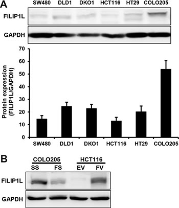 Figure 1: FILIP1L protein levels in human colorectal cancer cells. (A). Endogenous FILIP1L protein levels were measured in various human colorectal cancer cell lines using Western blots. GAPDH was used as a loading control. Graphical representations of band intensities quantified using the Multi-Gauge Ver3.0 gel analysis software are shown. (B). Knockdown and overexpression of FILIP1L protein was performed using FILIP1L siRNA and pcDNA6-myc-FILIP1L, respectively. SS, scramble siRNA; FS, FILIP1L siRNA; EV, empty-pcDNA6-myc vector; FV, pcDNA6-myc-FILIP1L vector.