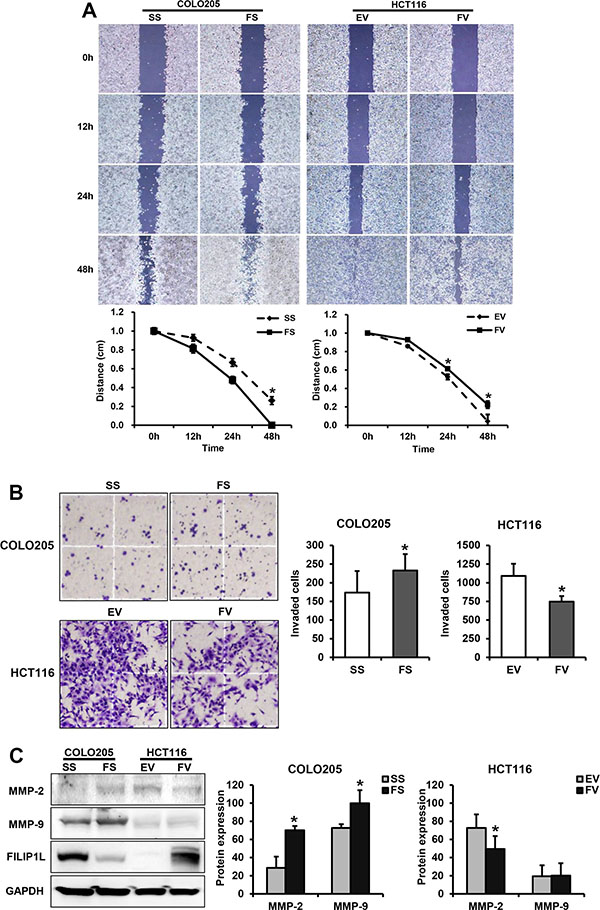 Figure 2: FILIP1L inhibits migration and invasion in human colorectal cancer cells. (A) The impact of FILIP1L on colorectal cancer cell migration. Wound healing assays were performed using FILIP1L siRNA- or pcDNA6-myc vector-transfected cells; graphs of cell migration display relative healing distances (mean ± SE, n = 3; *P < 0.05). (B) The impact of FILIP1L on colorectal cancer cell invasion. The invasion assay was performed using FILIP1L siRNA- or pcDNA6-myc vector-transfected cells. Stained invading cells were counted and are shown for each group (mean ± SE, n = 6; *P < 0.05). (C) The impact of FILIP1L on MMP-2 and -9 levels in colorectal cancer cells. Graphs show the mean ± SE (*P < 0.05). SS, scramble siRNA; FS, FILIP1L siRNA; EV, empty-pcDNA6-myc vector; FV, pcDNA6-myc-FILIP1L vector.