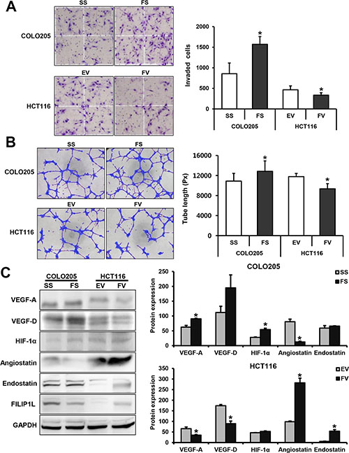 Figure 4: FILIP1L inhibits angiogenesis in human colorectal cancer cells. Matrigel invasion and tube formation assays using conditioned medium from human colorectal cancer cells transfected with either FILIP1L siRNA or pcDNA6-myc vector were performed to evaluate the effects of FILIP1L on angiogenesis in human umbilical vein endothelial cells (HUVECs). (A) Invasion of HUVECs (mean ± SE, n = 3; *P < 0.05). (B) Tube formation in HUVECs (mean ± SE, n = 3; *P < 0.05). (C) The impact of FILIP1L on VEGF-A, -D, HIF-1α, angiostatin, and endostatin levels. Graphs show the mean ± SE (*P < 0.05). SS, scramble siRNA; FS, FILIP1L siRNA; EV, empty-pcDNA6-myc vector; FV, pcDNA6-myc-FILIP1L vector.