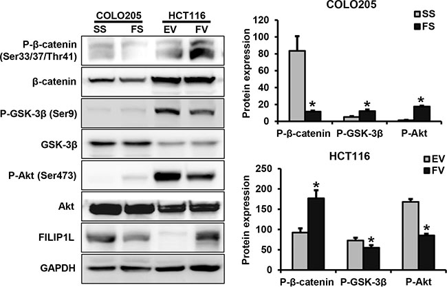 Figure 5: The impact of FILIP1L on intracellular signaling pathways in human colorectal cancer cells. FILIP1L knockdown increased levels of phosphorylated Akt and GSK-3β and decreased level of phosphorylated β-catenin. In contrast, FILIP1L overexpression decreased levels of phosphorylated Akt and GSK-3β and increased level of phosphorylated β-catenin. Graphs show the mean ± SE (*P < 0.05). SS, scramble siRNA; FS, FILIP1L siRNA; EV, empty-pcDNA6-myc vector; FV, pcDNA6-myc-FILIP1L vector.