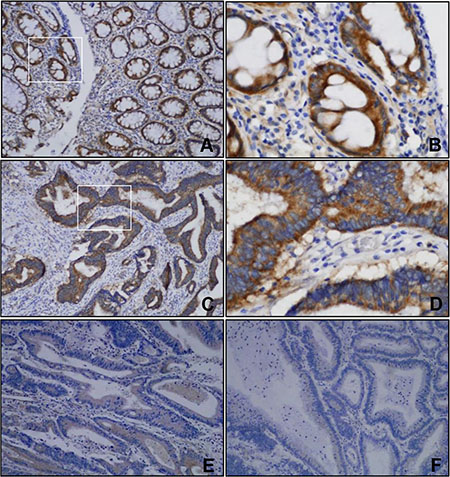 Figure 6: Representative images of immunohistochemical staining of FILIP1L. (A) (×100) and (B) (×400), Strong FILIP1L expression was observed in the cytoplasm of normal colorectal epithelial cells. (C–F) FILIP1L expression in colorectal cancer tissues. (C) (×100) and (D) (×400), A score of 3 indicated strong immunostaining intensity for FILIP1L. (E) (×100), A score of 2 indicated moderate immunostaining intensity for FILIP1L. (F) (×100) A score of 1 indicated weak immunostaining intensity for FILIP1L.