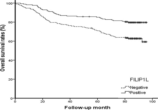 Sections were deparaffinized in xylene and rehydrated with graded ethanol solution (100–70%). Antigen retrieval was performed by boiling in citrate buffer (pH 6.0, Dako, Carpentaria, CA, USA), and endogenous peroxidase activity was blocked with peroxidase-blocking solution (Dako). Non-specific reactivity was blocked with DAKO® Protein Block Serum-Free solution (Dako). Sections were incubated with primary anti-FILIP1L (Abcam), -Ki-67 (Dakopatts, Glostrup, Denmark), and -CD34 (Abcam) antibodies. Bound antibody was visualized with the DakoReal™ Envision HRP/DAB detection system (Dako). Nuclear counterstaining was performed with hematoxylin (Sigma-Aldrich, St. Louis, MO. USA). Stained tissues were viewed and photographed under a light microscope. Immunohistochemical staining was assessed by two independent pathologists without knowledge of patient clinical outcome data. FILIP1L staining intensity was scored as follows: 0, no staining; 1, weak; 2, moderate; 3, strong. Percentage of cells stained was also scored (1: 0%–25%; 2: 26%–50%; 3: 51%–75%; 4: > 75%). The final score for each sample was calculated by multiplying the staining intensity score by the percentage score. Final scores for the 354 tumor samples ranged from 0.0 to 12.0 with a mean of 7.5. The mean final score value for each sample served as the cut-off point for categorization of the 354 tumor samples into positive and negative expression groups; samples with a final score ≥ 8 were designated positive for FILIP1L expression.
