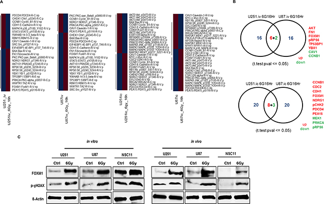 To determine the effects of radiation on signaling pathways in GBM, we assessed the modulation of phosphorylated and non-phosphorylated proteins using RPPA. Levels of 172 proteins were compared in U251 and U87 GBM tumor cells grown in vitro and in-vivo with and without RT. We identified subsets of proteins with differential expression between GBM cells grown in vitro and those grown in vivo in an orthotopic mouse model (Figure 1A). We observed upregulation of AKT, FN1, FOXM1, pRPS6, TP53BP1 and YBX1 and down regulation of CAV1 and CCNB1 in irradiated U251 and U87 cells grown in vitro. Under in-vivo conditions, we observed CCNB1, CDC2, CDH1, FOXM1, NDRG1, pCHK2, PDCD4 and PEA15 upregulation and MEK1, PRKCA and pRPS6 down regulation in irradiated U251 and U87 tumors (Figure 1B). However, FOXM1 was upregulated both in vitro and in vivo conditions after RT. Immunoblot analysis confirmed the increased levels of FOXM1 in irradiated GBM tumor cells (U251 and U87) (Figure 1C). We also observed RT induced upregulation of FOXM1 in the GBM stem cell line, NSC11 under both in vitro and in vivo conditions (Figure 1C).