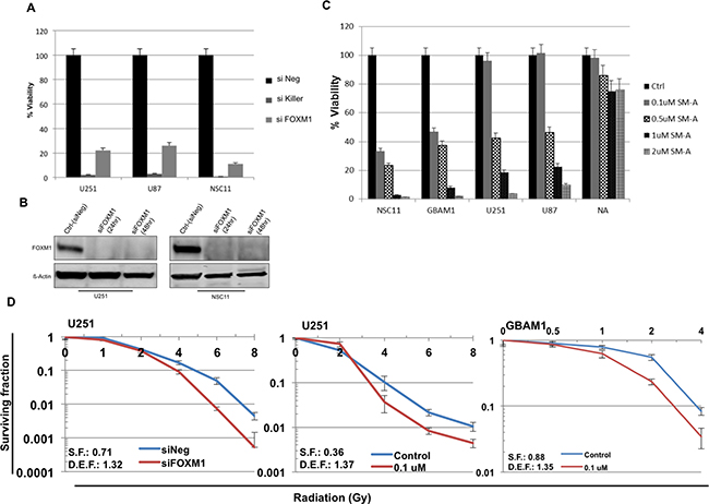 Figure 2: FOXM1 inhibition effects cell proliferation and sensitizes GBM cells to RT. The human GBM U251, U87 and NSC11, cells transfected with siFOXM1, or negative (siNeg) siRNA in triplicate. Cell viability was assessed (Cell Titer Glow) at 96 hour after transfection A. B. western blot analysis of FOXM1 protein levels in siFOXM1 treated U251 and NSC11 cells. Panel C. represents bar graph for % cell viability in U251, U87, NSC11 and GBAM1 treated with Siomycin-A (0.1-2uM) or DMSO (control). Cell viability was assessed (Cell Titer Glow) 96 hour after treatment. Data is shown as Mean ± SD. Panel D. clonogenic survival assay in U251 and GBAM1 cells, with a dose enhancement factor (DEF) of 1.32 (siFOXM1) and 1.37 (0.1uM Siomycin-A) for U251 cells and DEF of 1.35 (0.1uM Siomycin-A) for GBAM1 cells. Values represent the Mean ± SD for three independent experiments.