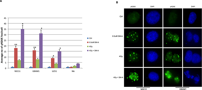 To assess the effects of FOXM1 inhibition on DNA damage and repair, RT induced double-strand breaks (DSB) were examined by γH2AX foci formation. Cells were treated with either SM-A alone or the combination of SM-A and radiation, and the average number of γH2AX foci at 24hr were counted. We observed significant (P<0.005) increased levels of γH2AX foci in SM-A plus RT GBM (NSC11, GBAM1, U251) cells, but not in normal astrocytes (Figure 3A). The results indicate persistence of RT-induced DNA-damage lesions after FOXM1 inhibition in GBM tumor stem cells, whereas the majority of DNA lesions were repaired in normal astrocytes. A significant (p<0.05) retention of γH2AX foci in NSC11 and GBAM1 cells treated with SM-A alone was also observed (Figure 3A and 3B). Representative images of γH2AX foci in NSC11 and GBAM1are shown (Figure 3B). These results suggest that inhibition of FOXM1 leads to incomplete repair of DNA double strand breaks in GBM tumor cells.