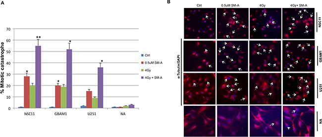 Due to FOXM1’s known role in mitotic catastrophe and cell cycle progression [11, 12], mitotic catastrophe was measured in SM-A treated GBM cells. Cells undergoing mitotic catastrophe indicated by the presence of giant cells with multilobulated nuclei and aberrant mitoses, were visualized and scored by staining with anti-tubulin antibody (red) and nuclei with (blue) at 48hr after SM-A treatment (Figure 4). We observed a significant increase (p <0.05) in percentage of GBM cells undergoing mitotic catastrophe after concurrent SM-A and RT treatment (p < 0.005 NSC11 & GBAM1, p <0.05 U251), whereas normal astrocytes showed minimal mitotic catastrophe (Figure 4A and 4B). These results indicate that one of the mechanisms of cell death is the induction of mitotic catastrophe.