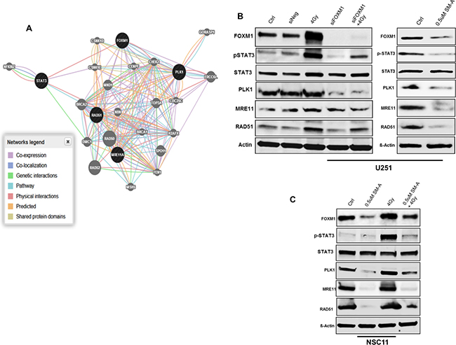 Figure 5: FOXM1 regulates genes associated with cell cycle progression and DNA repair. Panel A. shows the molecular functional network map of canonical pathways including coexpression, physical interaction, and predicted networks of FOXM1 analyzed by GeneMANIA (http://genemania.org/) tool. Panel B. represent immunoblots of lysates prepared from U251 cells (panel C. NSC11 cells) treated (24hr after treatment) as indicated for molecules involved in DNA repair (MRE11, RAD51), chromosomal segregation (PLK1) and cell survival (total STAT3 and phospho STAT3). A representative data from three independent experiments is shown.