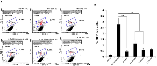 Given this altered expression in key members of the DNA damage response MRE11 and RAD51, we next investigated whether FOXM1 affects DNA repair efficacy, by examining one of the major DNA-double strand break (DSB) repair pathway, homologous recombination (HR) pathway. We examined HR in U251 cells using DR-GFP plasmid as described (Supplementary Methods). The HR assay relies on the two inactivated tandem repeat (DR-GFP) transfected cells to express GFP detected by flow cytometry. U251 cells transfected with siNegative was used as a negative control and U251 cells transfected with siNegative and DR-GFP plasmids as a positive control (Figure 6). Positive control cells showed 2.78% GFP positive cells. Cells transfected with either siFOXM1 (p<0.005) or treated with SM-A (p<0.05) showed significant decrease in percentage GFP+ cells compared to negative control cells (Figure 6). These results indicate FOXM1 abrogation affects DNA-DSB repair efficacy by inhibiting HR-DSB repair, further validating FOXM1’s role in DNA damage and repair response.